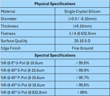 The DEMMR (Dual Enhanced Maximum Metal Reflection) Mirror is optimized for ultra-high reflectance at 10.6um and at 630-670nm at 45° AOI. These are generally used as turning mirrors where high reflectance is required in both the IR and visible. High durability. High performance. Made in the USA.