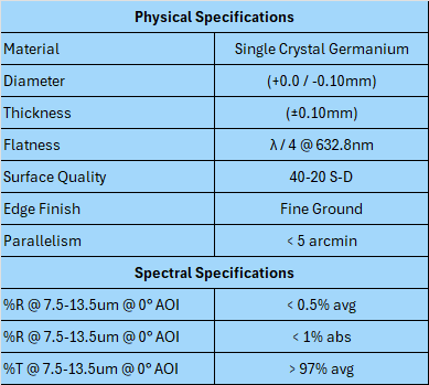 Our germanium windows feature high transmittance across 7.5-13.5um @ 0° AOI. The robust coating design will resist the elements and pass standard MIL-Spec abrasion, adhesion, and humidity tests.