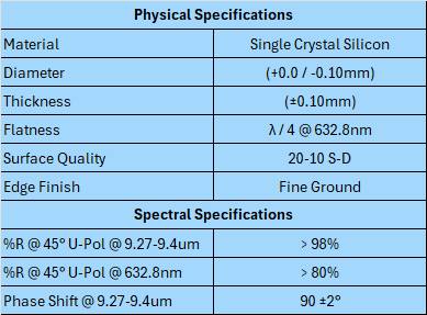 CO2 Laser Mirror - Silicon 90° Phase Shift for 9.27-9.4um