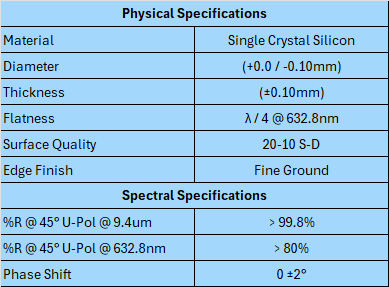 CO2 Laser Mirror - Silicon Zero Phase Shift for 9.3-9.4um