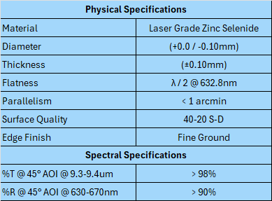 Our Zinc Selenide Beam Combiners make CO2 beam alignment easy by transmitting the 9.3-9.4um beam and reflecting the visible beam (630-670nm). Optimized for use at 45° AOI. High performance. High durability. Made in the USA.