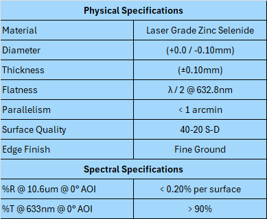 These ZnSe Windows are optimized for high transmittance at 10.6um and 633nm. High durability. High performance. Made in the USA.