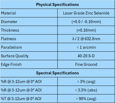 Our ZnSe Windows are optimized for high transmittance from 3-12um @ 0° AOI. High durability. High performance. Made in the USA.